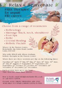 Would you like a bit of TLC? Thanks to funding from the Community Chest Fund we are able to offer unpaid carers in Fife FREE THERAPIES in our therapy room at the Paxton Centre.